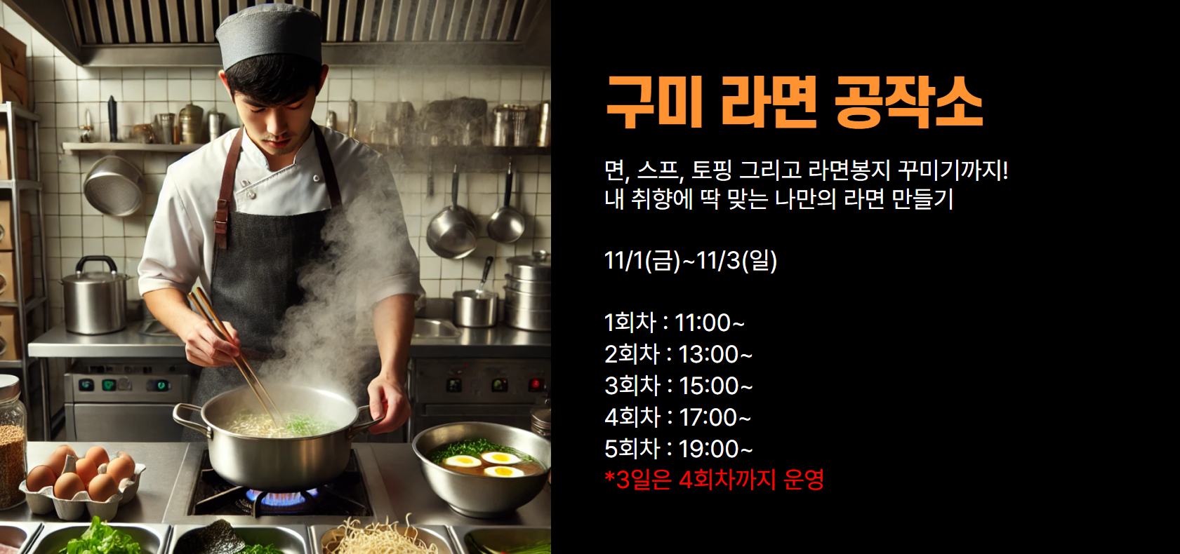2024 구미 라면축제는 11월 1일(금)부터 11월 3일(일)까지 3일간 구미역 일원에서 개최됩니다. 매일 오전 10시부터 저녁 8시까지 운영되며, 마지막 날인 11월 3일은 오후 6시까지 진행됩니다. 이 기간 동안 다양한 프로그램과 이벤트가 준비되어 있으니, 많은 관심 부탁드립니다!