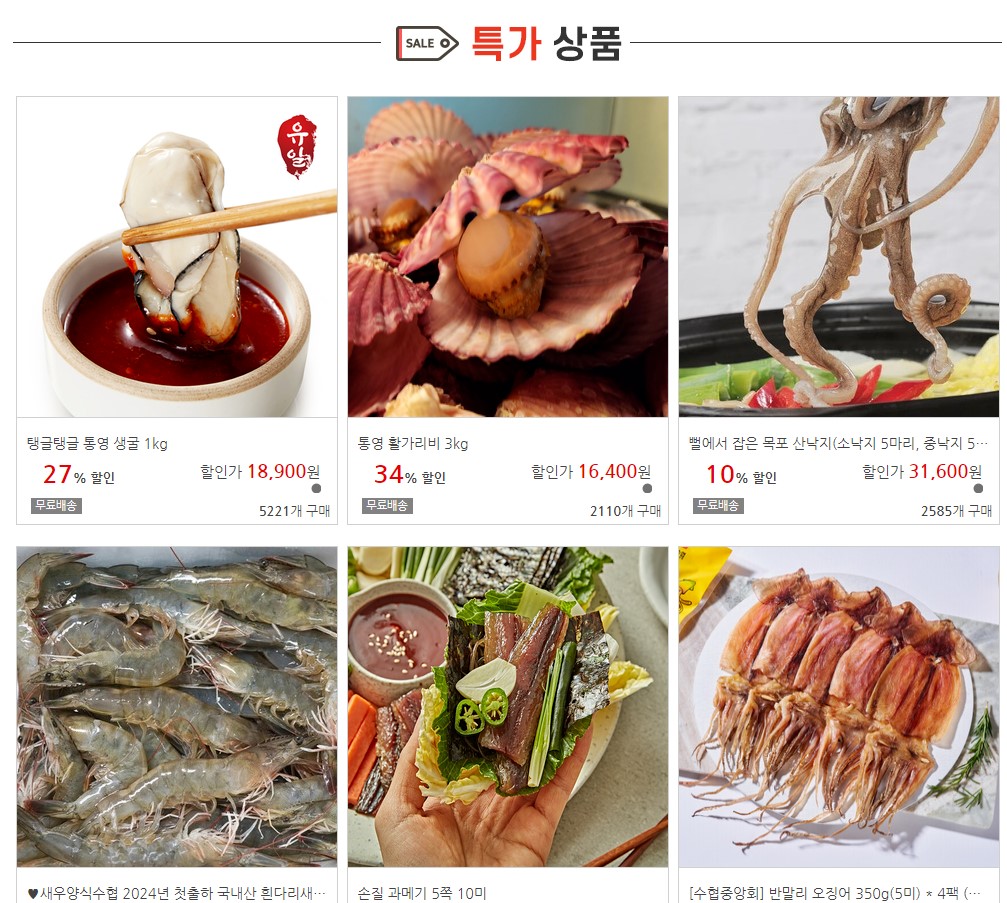 • 조개류 : 굴, 전복, 홍합 등 신선한 조개류를 할인된 가격에 제공할 예정입니다.