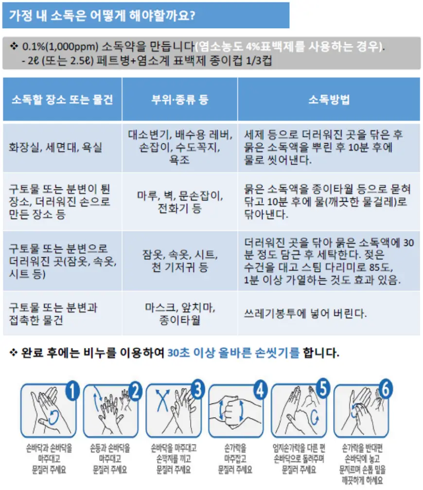 - 감염자가 사용한 식기, 수건, 침구류 등은 반드시 뜨거운 물과 세제로 깨끗이 세척합니다.