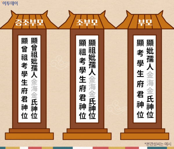 - 순서: 고위(아버지)를 왼쪽, 비위(어머니)를 오른쪽에 쓰며, 한 분만 돌아가셨을 경우에는 중앙에 모십니다.