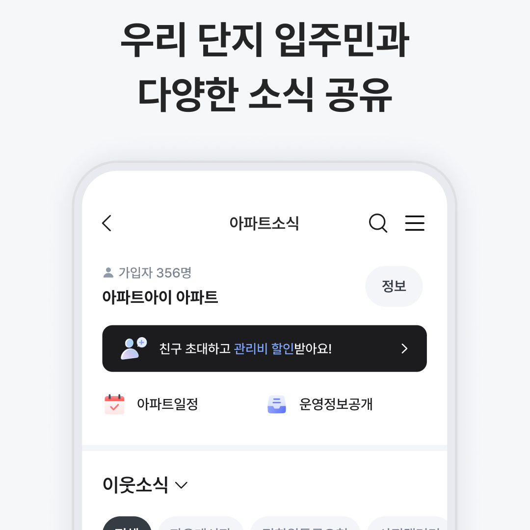 - 회원가입: 휴대폰 번호 인증 후 거주 아파트명을 검색해 등록합니다.