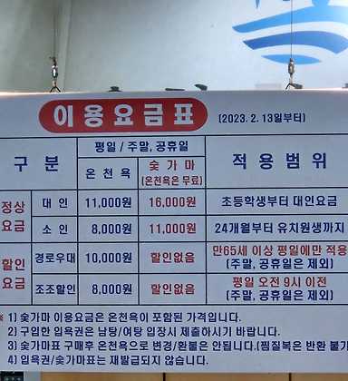 • 온천욕 + 숯가마: 성인 16,000원, 아동 11,000원