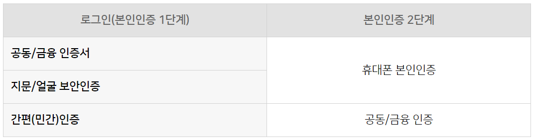 공동인증서나 금융인증서를 이용해 본인 인증을 완료합니다. 추가로 휴대폰 인증을 통해 복합 인증 절차를 거쳐야 합니다.