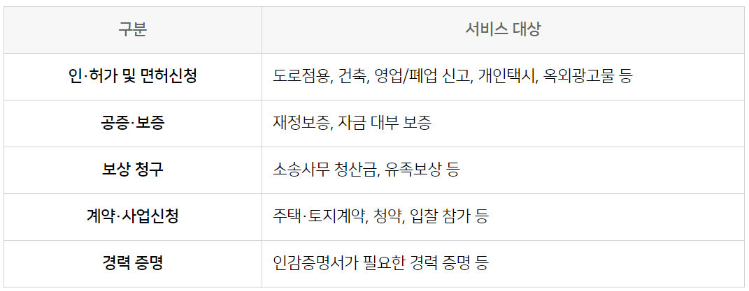 • 발급 알림 서비스: 인감증명서 발급 사실은 국민비서 또는 문자 서비스로 통보받을 수 있습니다.