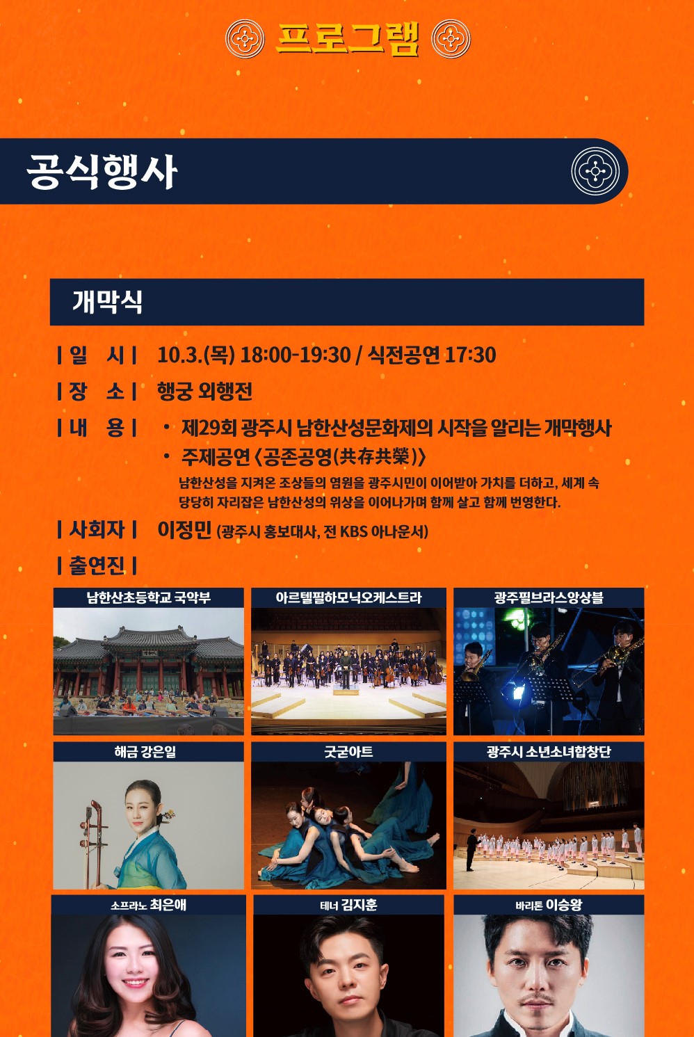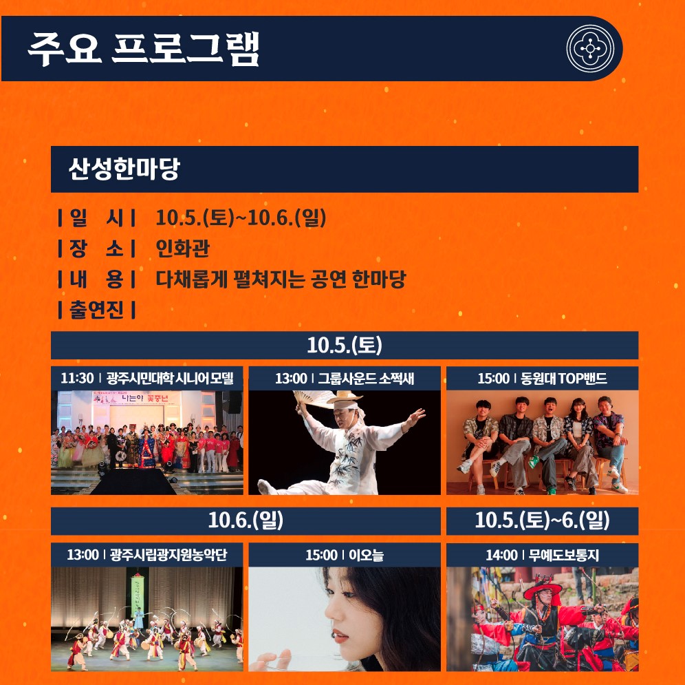남한산성 문화제에서는 다양한 프로그램이 진행됩니다. 그 중에서도 특히 주목할 만한 프로그램은 다음과 같습니다.