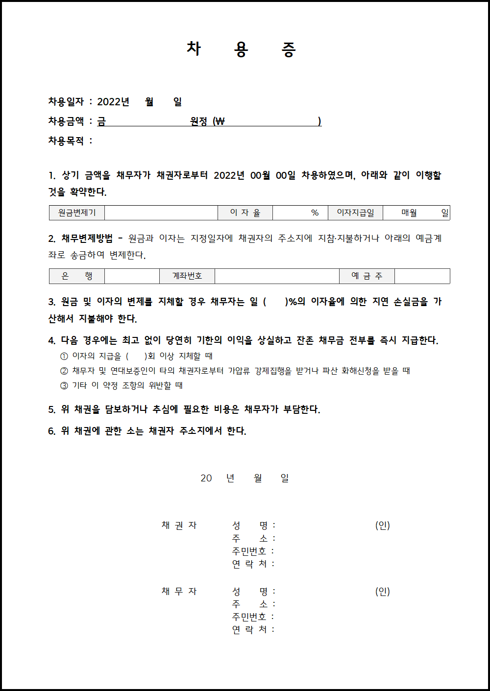- 상환일 : 차용인이 금액을 상환해야 하는 날짜를 적어야 합니다.