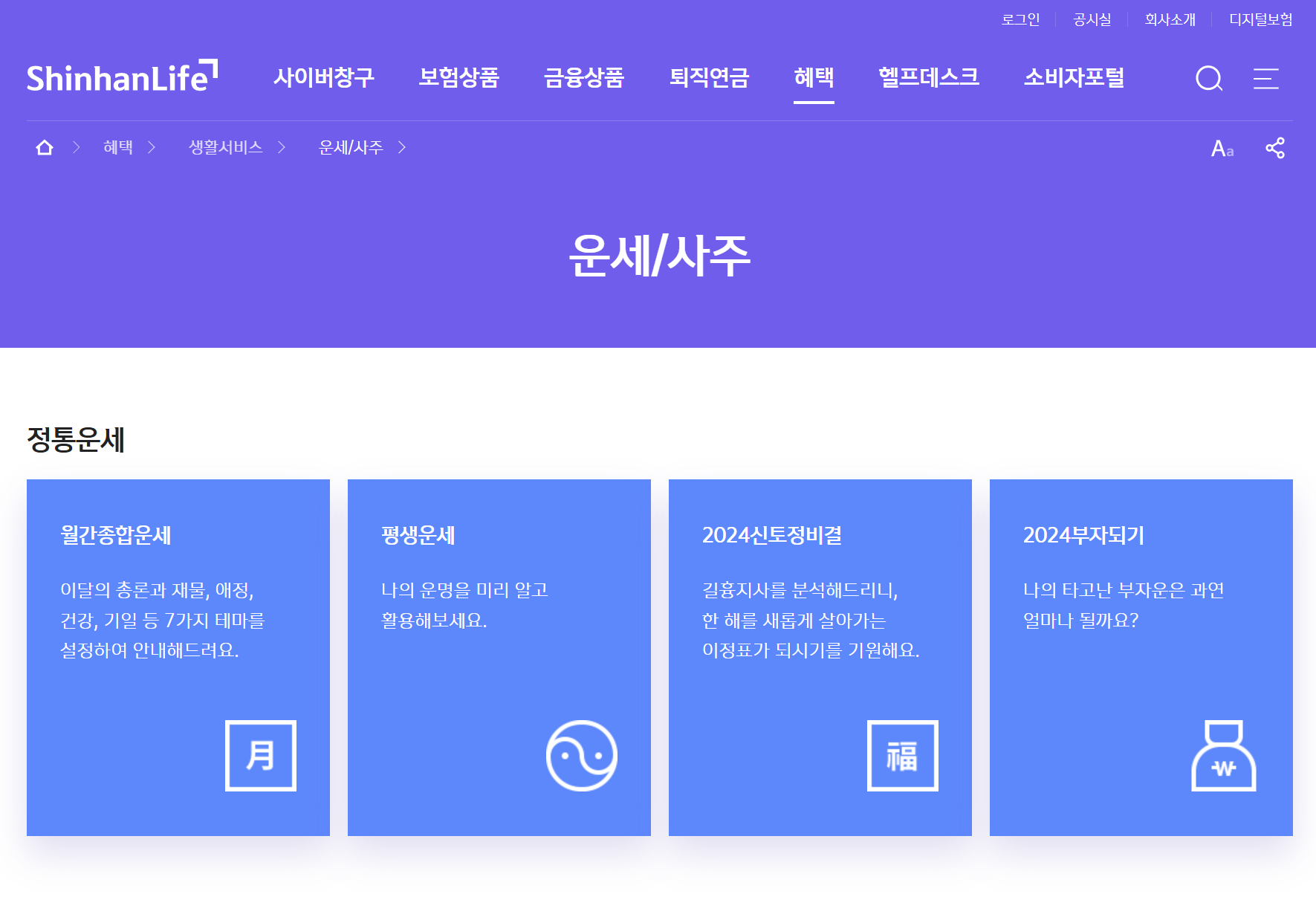 신한생명에서는 전통적인 사주와 운세를 기반으로 한 서비스를 제공합니다. 매우 신뢰할 수 있는 자료와 분석을 바탕으로 하여 자신의 운세를 알아볼 수 있습니다.