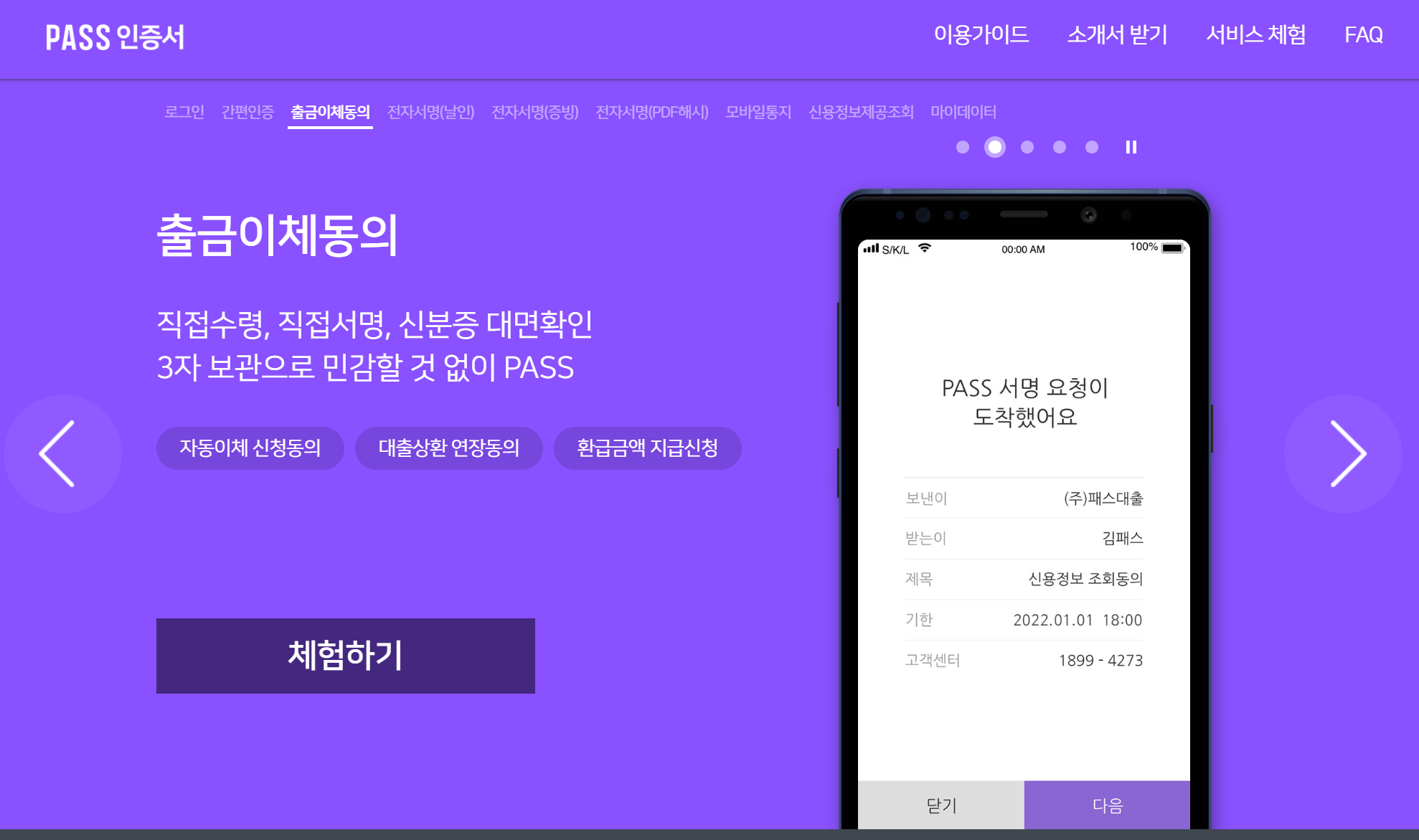 • PASS 인증서 : 전자 서명 및 인증서 발급이 가능합니다.